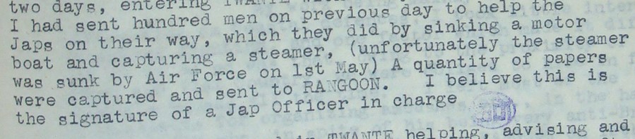 The Panda team ‘was able to send back from the Field useful information re coastal defences in the Delta, most of this was due to the efforts and help of THAKIN SOE.’