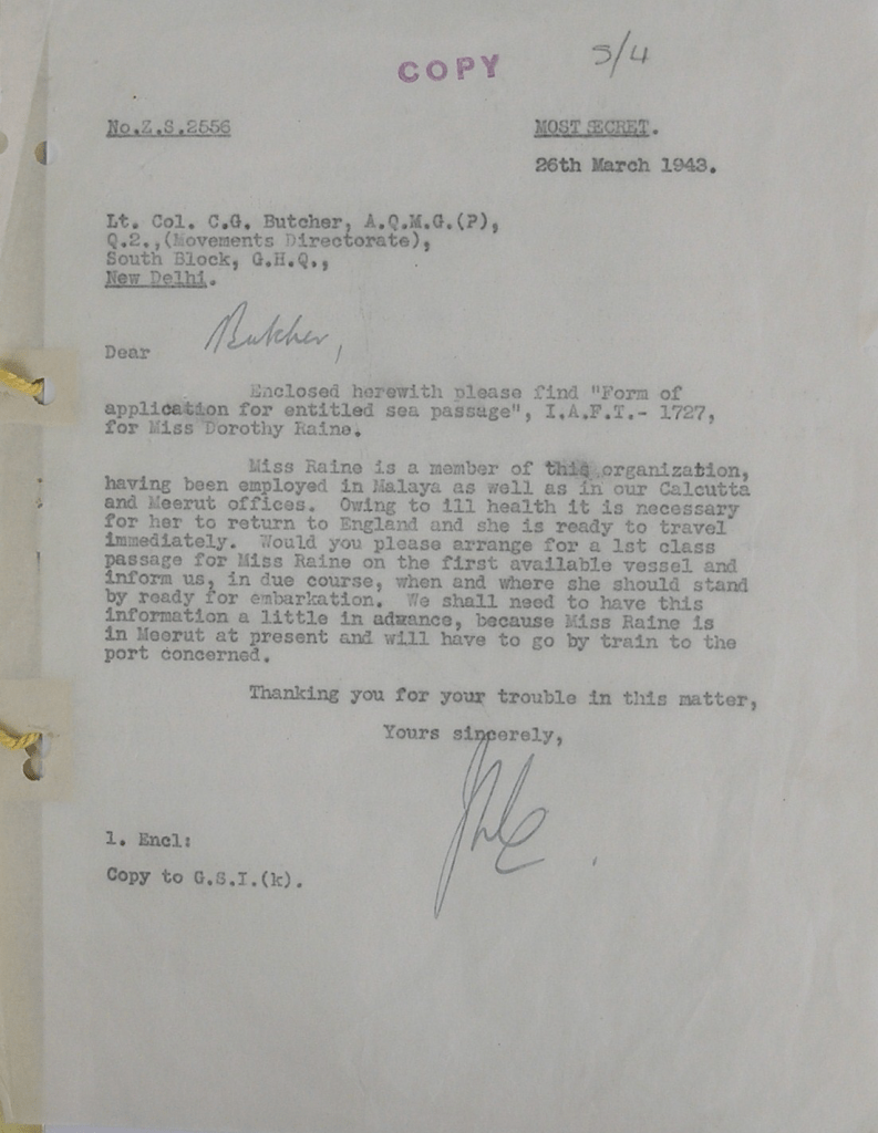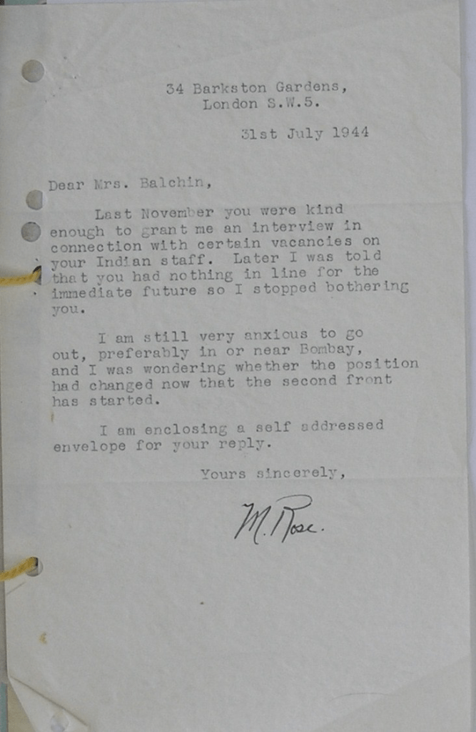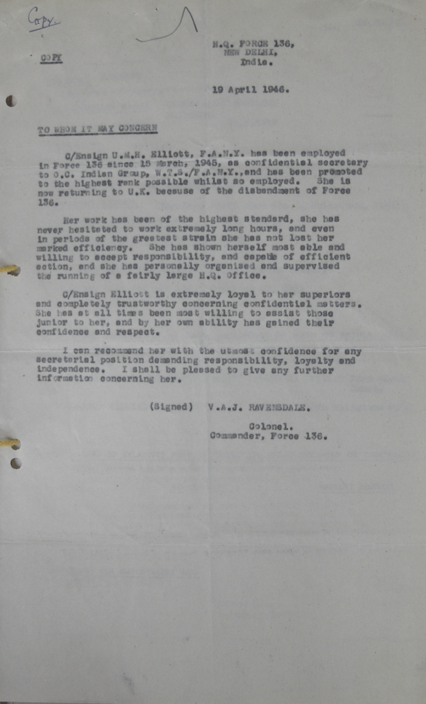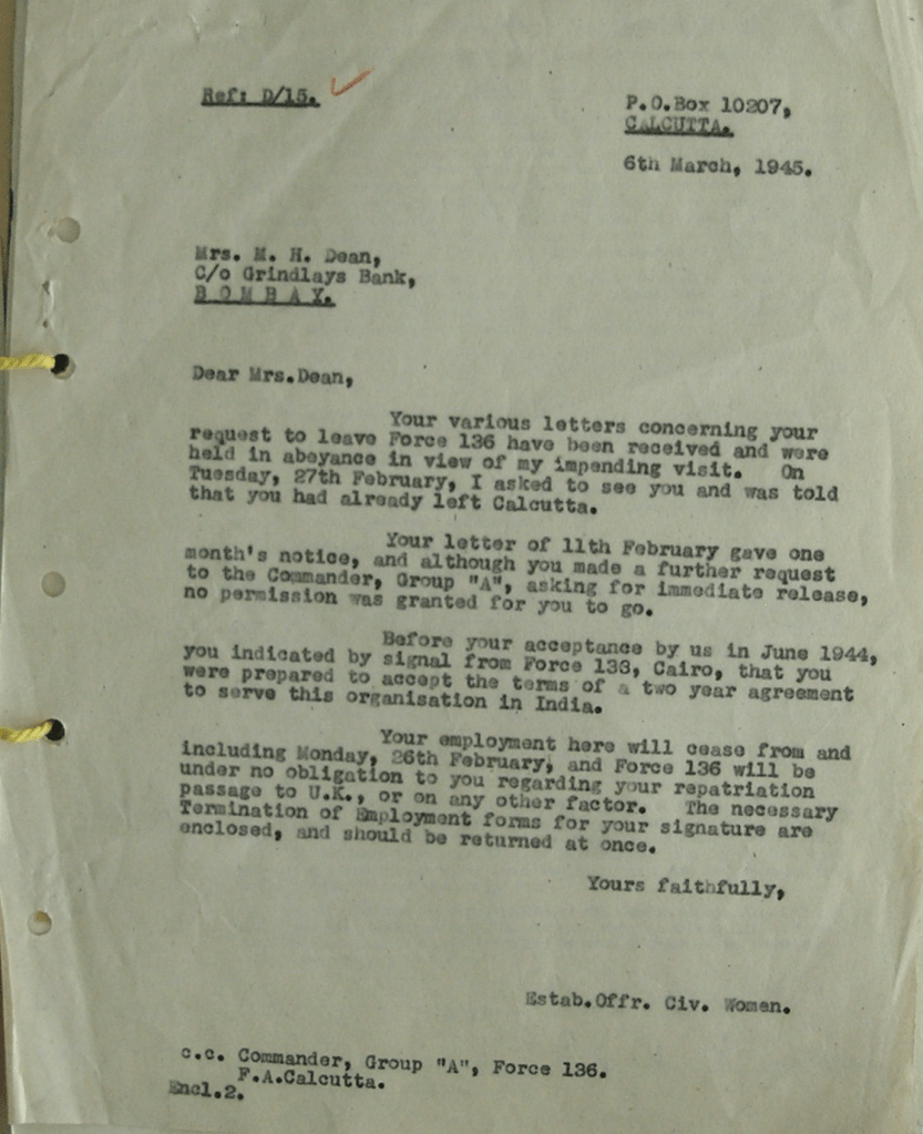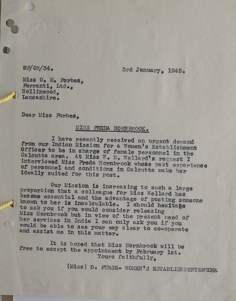 She was originally going to train to be a cypher clerk, but a more immediate posting to India came up, requiring her accountancy skills. She left for India on 18 July 1944.