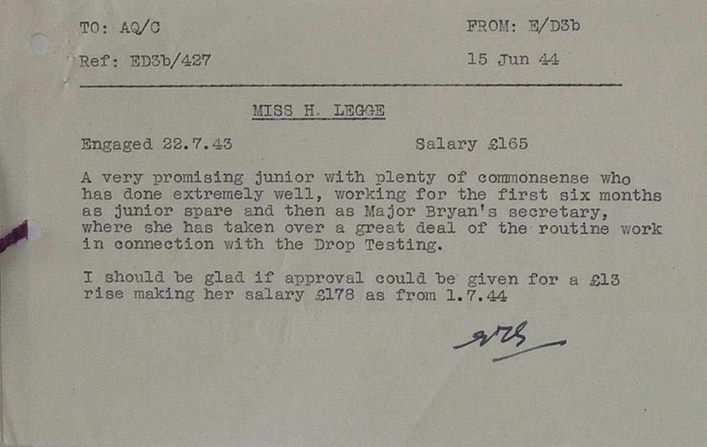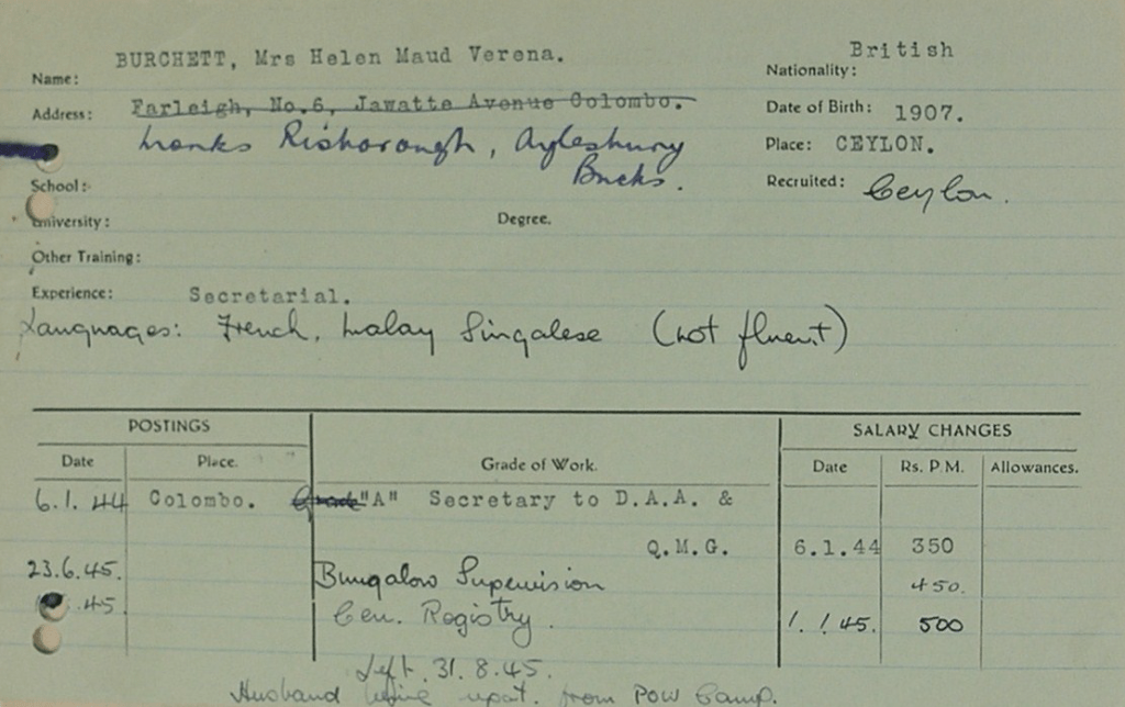 An entry dated 11 March 1942 indicates that Helen left SOE at that date, but by June 1943, she was working in the Political Warfare Division of SOE as a secretary, and by 1944 she was earning Rs700 (the largest wage seen yet).