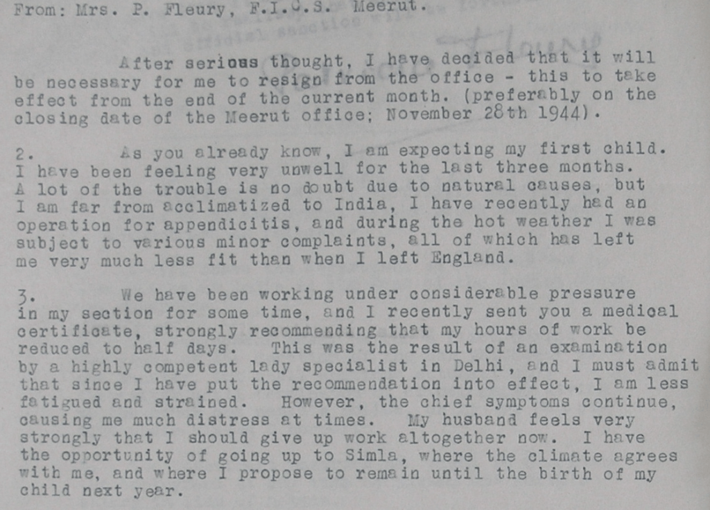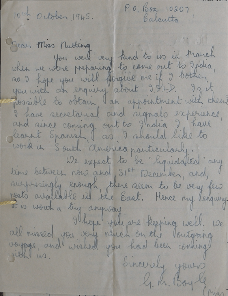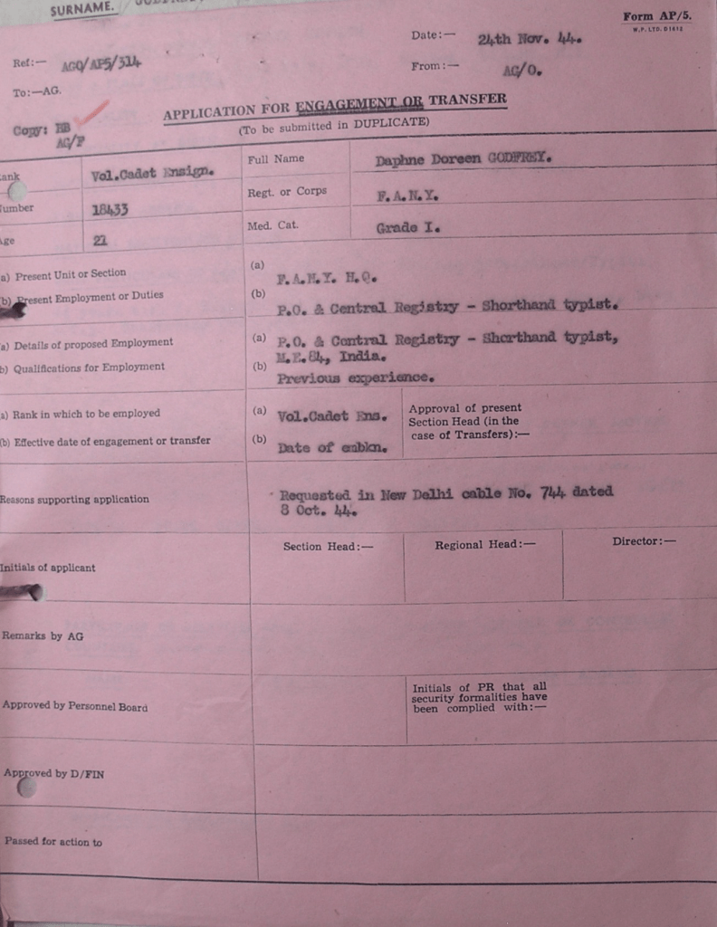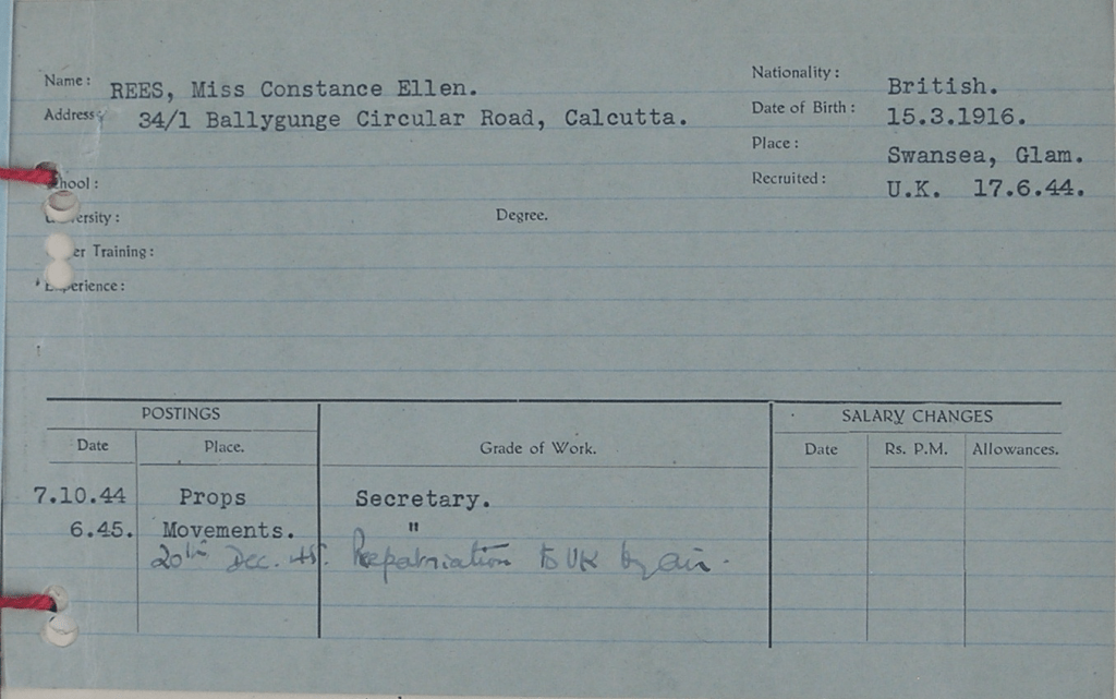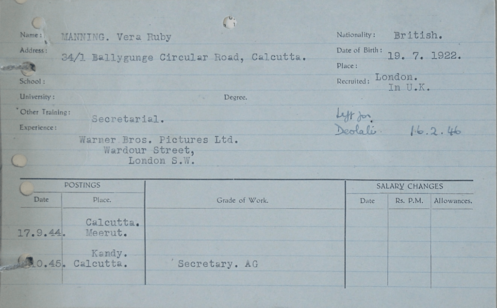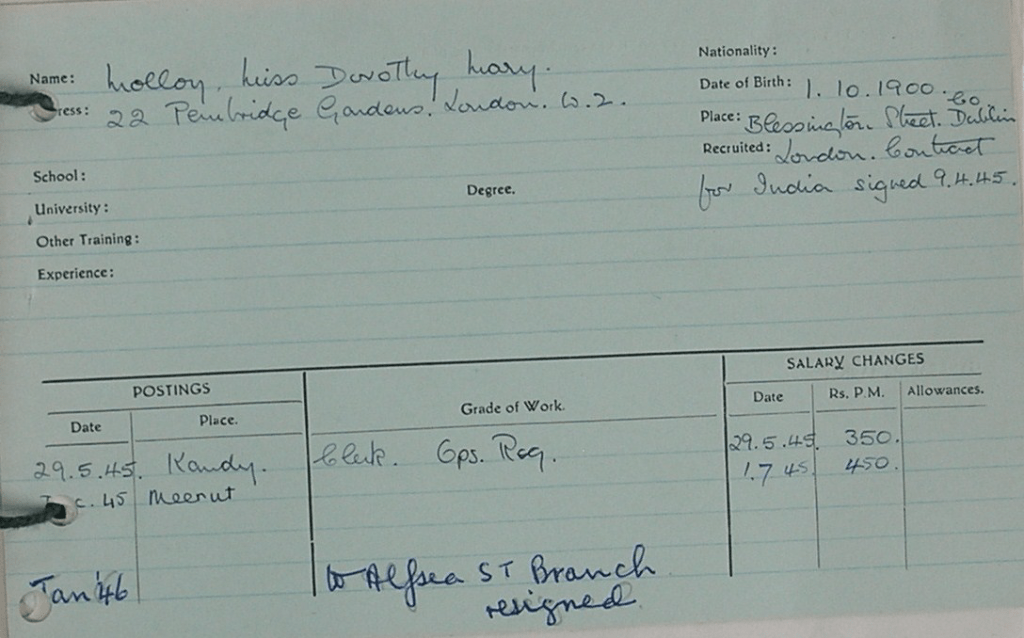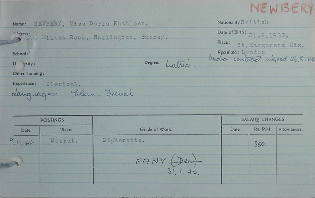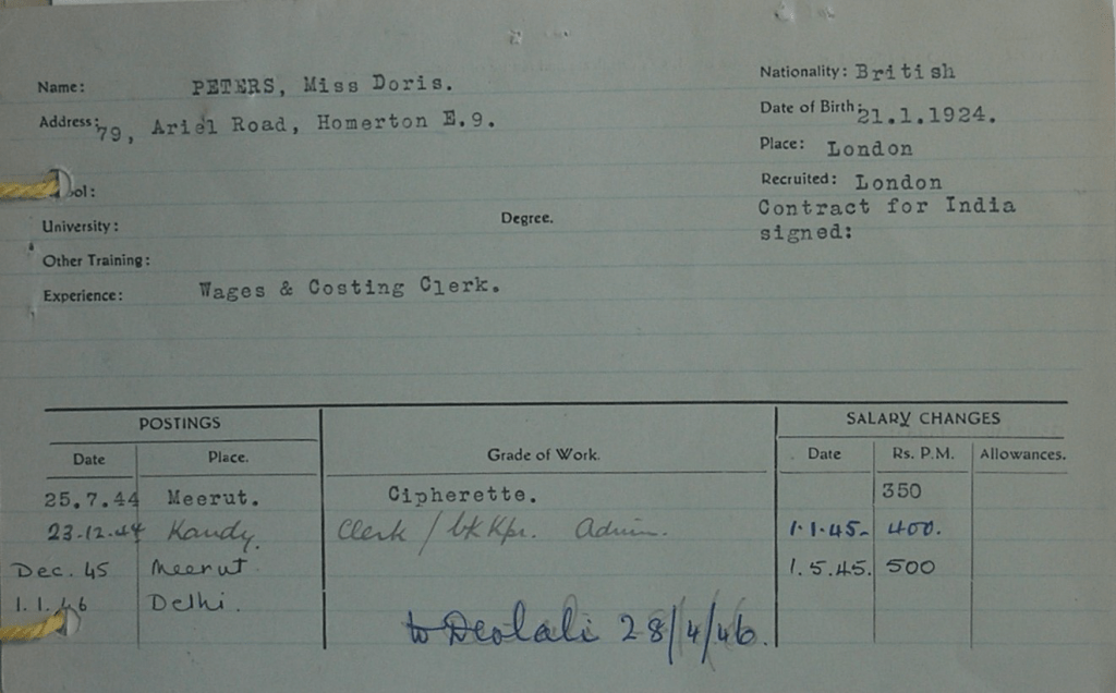 From 18 August, she was working in Meerut, and then in Delhi from October 1944. Her blue card shows she was a clerk in the Finance section, but her handwritten letter before leaving for India shows she expected employment as a cipherette.