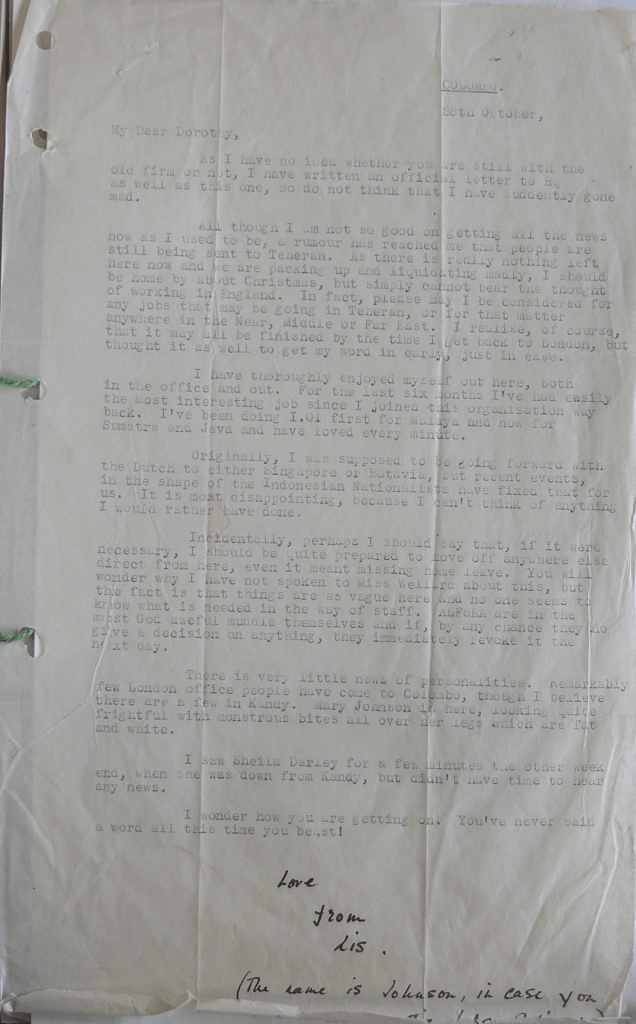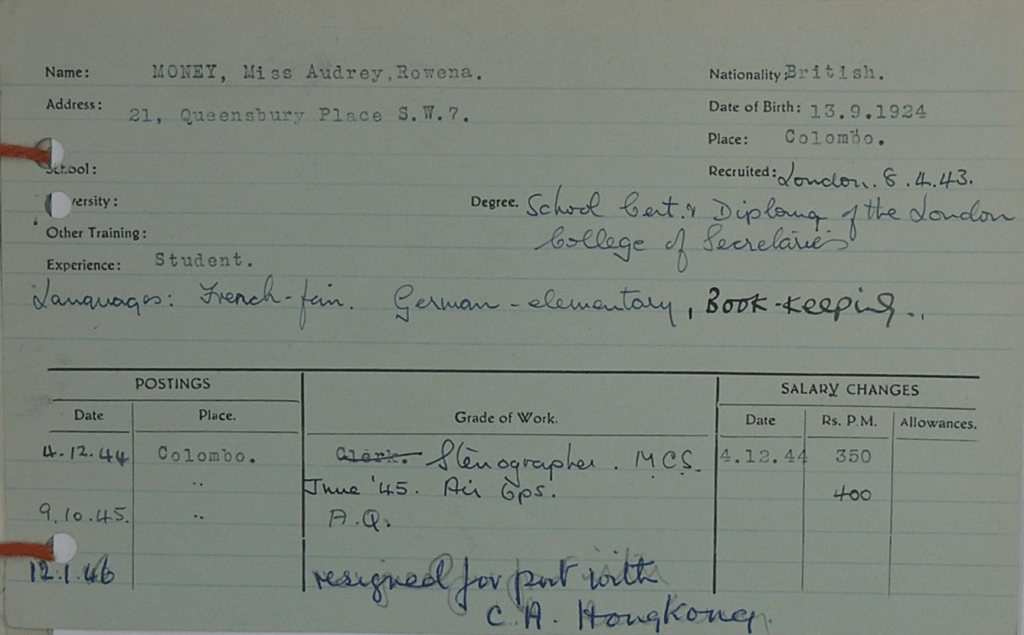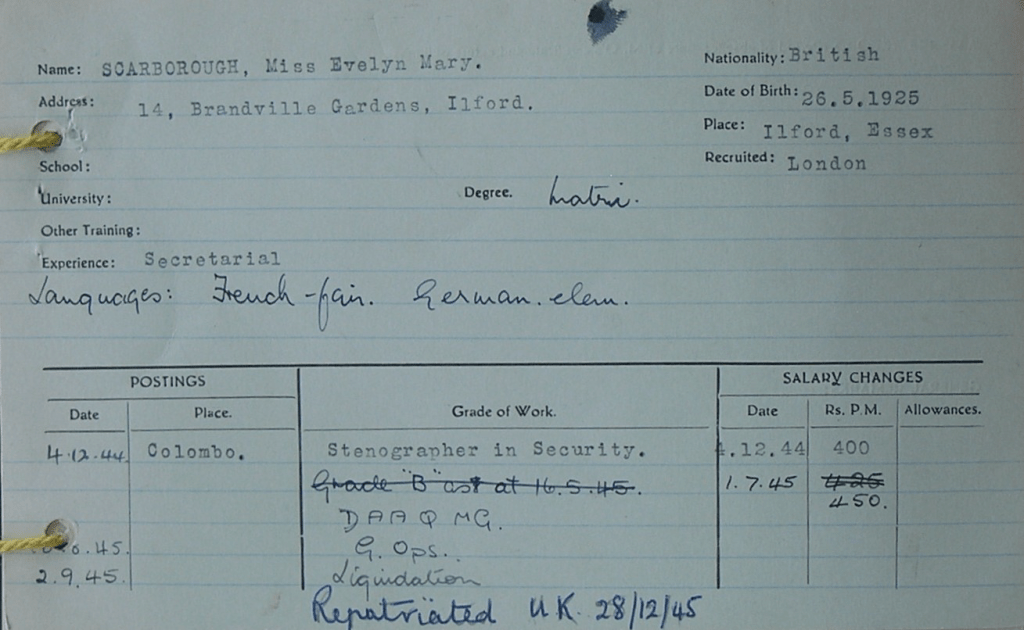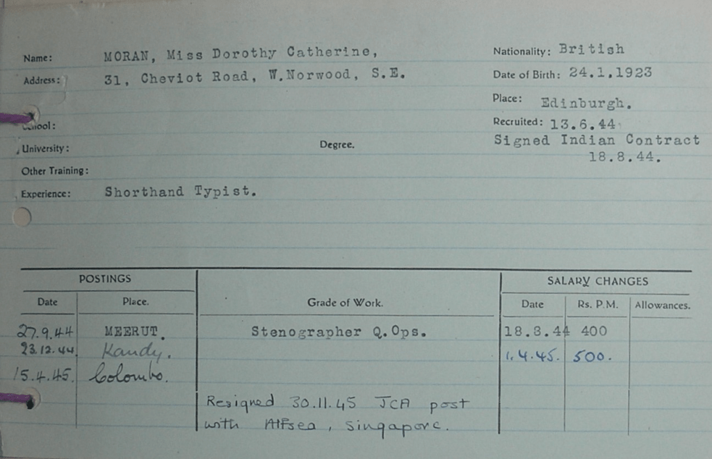 By 5 August 1945, Mary was in Colombo working as a stenographer, ending up in ‘Q’ by October. She resigned on 7 December and headed to Australia.