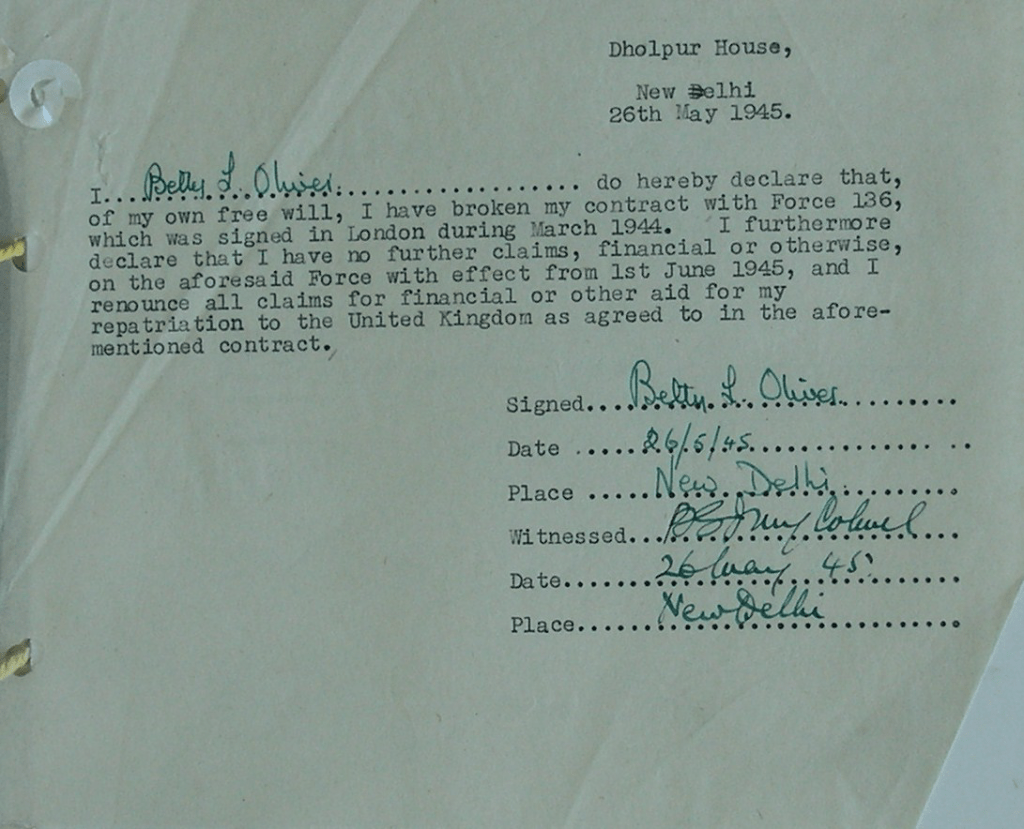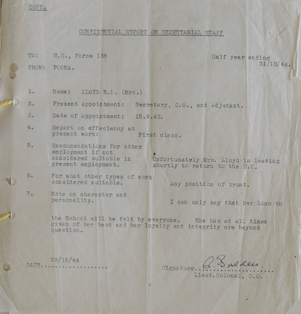 Just after her 19th birthday, on 9 June 1944, she left for India. She signed off from SOE on 23 January 1946 after returning to the UK.