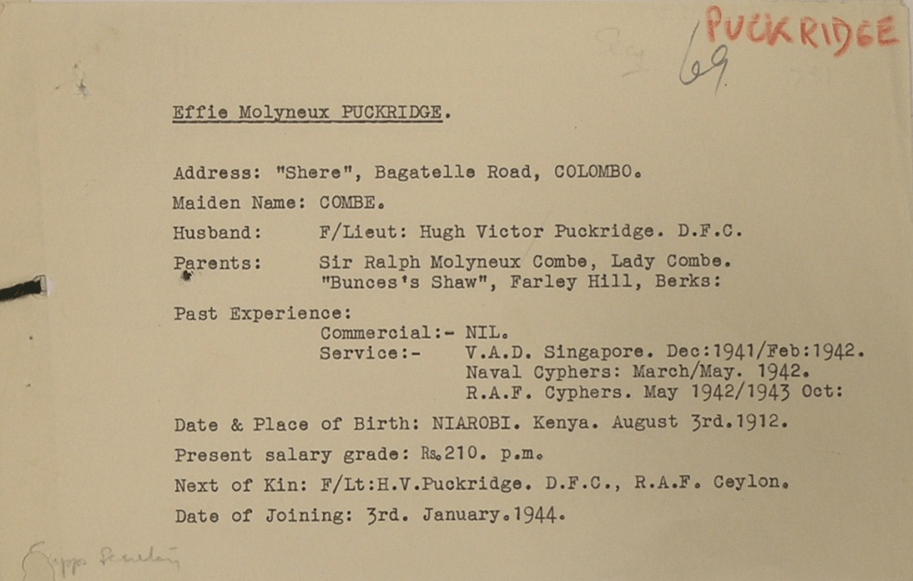 In March 1944 she went to England ‘for personal reasons’, and while in London she joined SOE. What she did between March 1944 and 29 June 1945 when she left for India remains a mystery. Back out east, she was posted to Trincomalee as a Cipherette. The second half of September was spent ill with fever, finally signing off from SOE on 29 November 1945 at the Galle Face Hotel in Colombo.