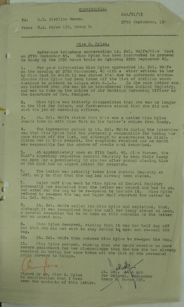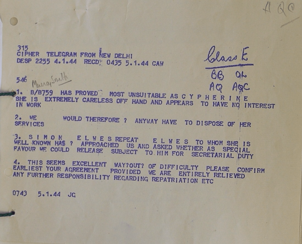 Dorothy ended up being at the centre of quite a tricky position for SOE to be in. It appears that she only joined the FANY and SOE in order to get posted to India and be with her husband, Lt.Col. Beck who was employed at GHQ. When she arrived in India, she did just a few days work, went sick, and then refused to go back to her duties. She claimed that her contract had not been kept, and that she had not been properly looked after. There was talk of deporting her, but it is unclear if this happened. There was lots of talk of dropping the case because SOE did not want a public court case on security grounds, but at the same time they did not want to encourage any more of this behaviour.