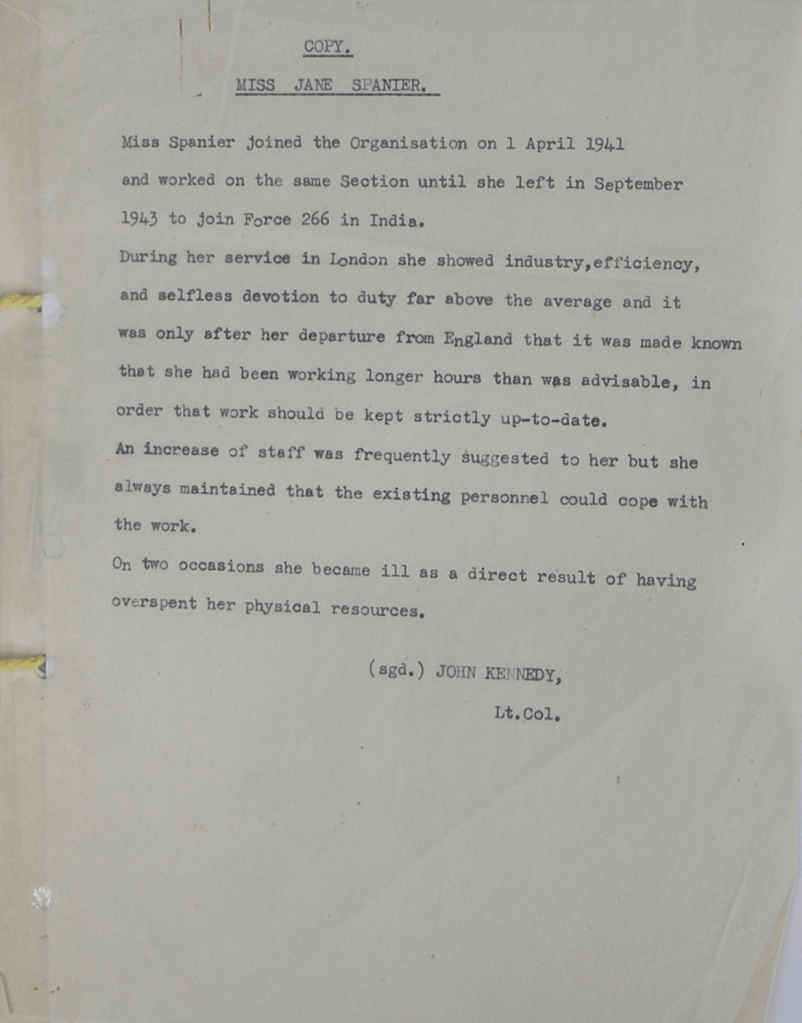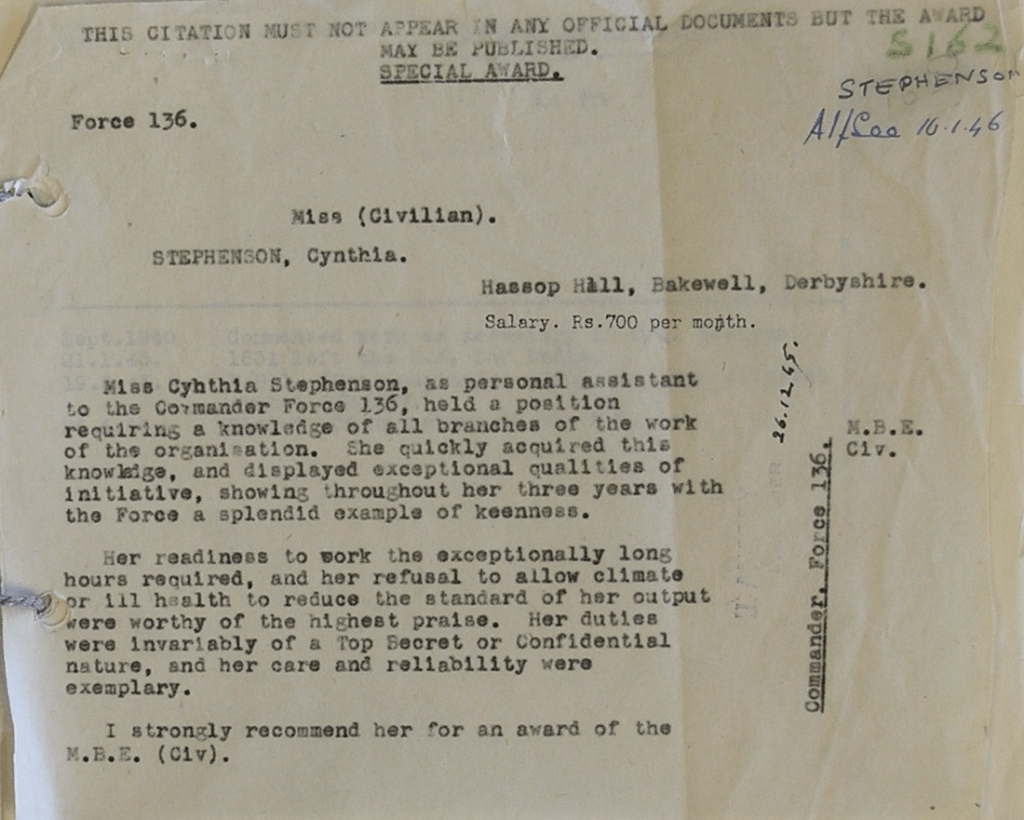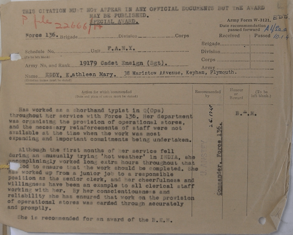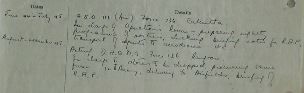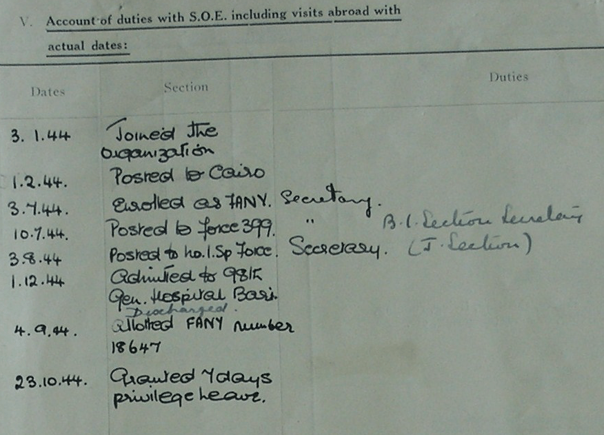 Her SOE career took her, first, to North Africa in December 1943, and then to India from 6 March 1945. She signed off from SOE on 1 April 1946 having just returned to the UK.
