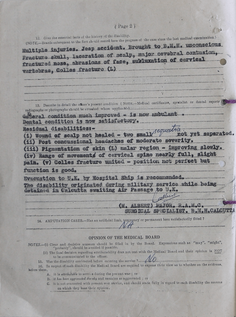 Audrey’s return to the UK was a medical evacuation after sustaining ‘multiple injuries’ in a jeep accident: ‘I was proceeding in a jeep along Theatre Rd. when another jeep came out of a side turning and hit us. I remember no more.’ It was 3am on Christmas Day 1945.