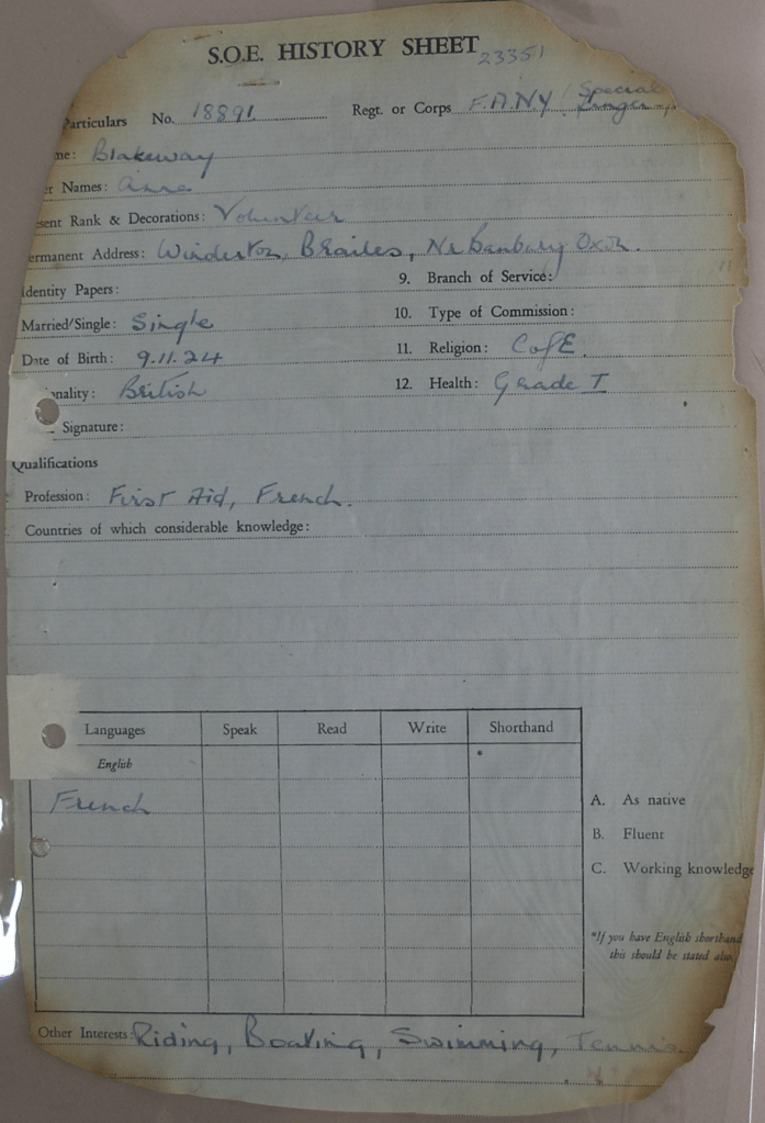 Blakeway, Anne: born 9 November 1924 in Birmingham, Anne was checked by MI5 in September 1944. She was working as an Assistant Matron. Employed as a FANY W/T operator, Anne left for India on 10 December 1944. She signed off from SOE on her return to the UK on 13 December 1945.