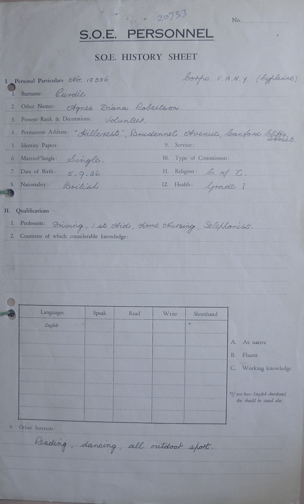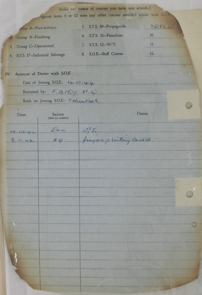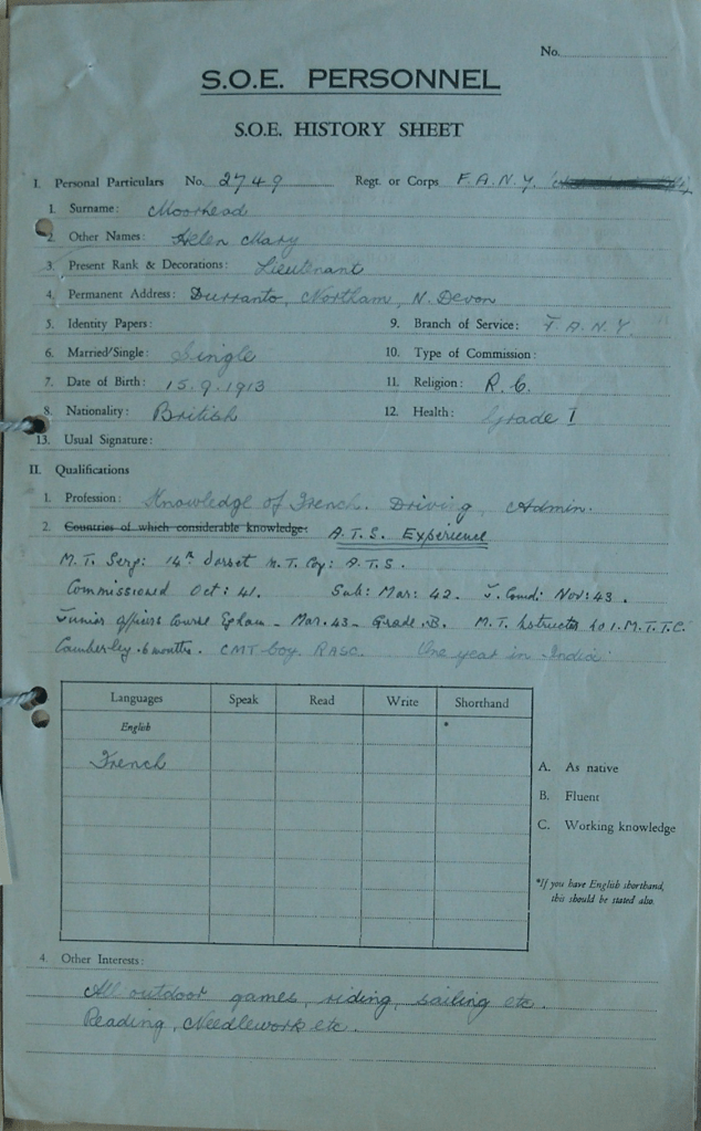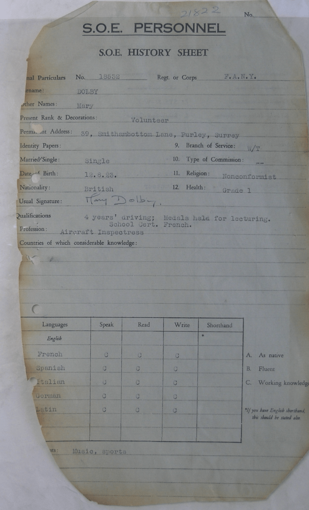 Flora lived in Malaya for a year, ‘staying with relatives’. Unusually, Flora has completed the ‘Technical Knowledge’ part of her SOE A4 Form: 2 years work as Secretary & Research Assistant in Wireless Section of the Political Intelligence Dept. of the Foreign office.’ She was dealing with enemy radio stations.