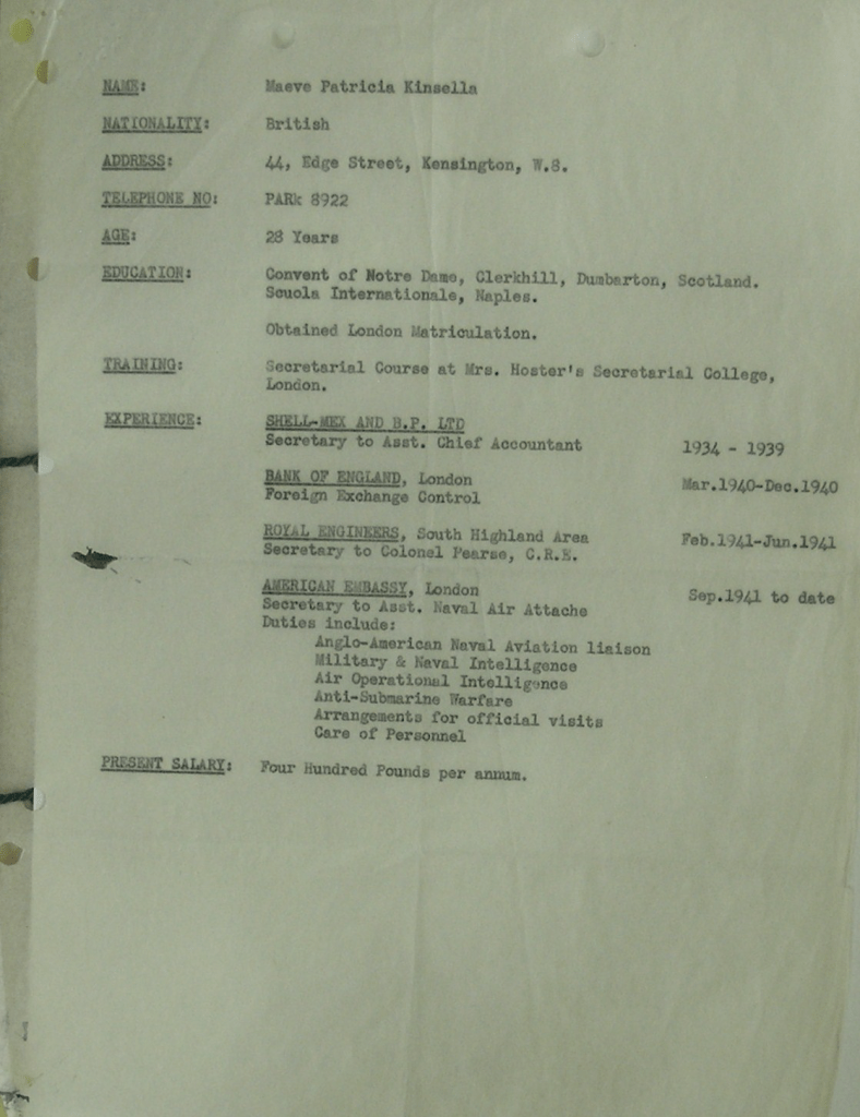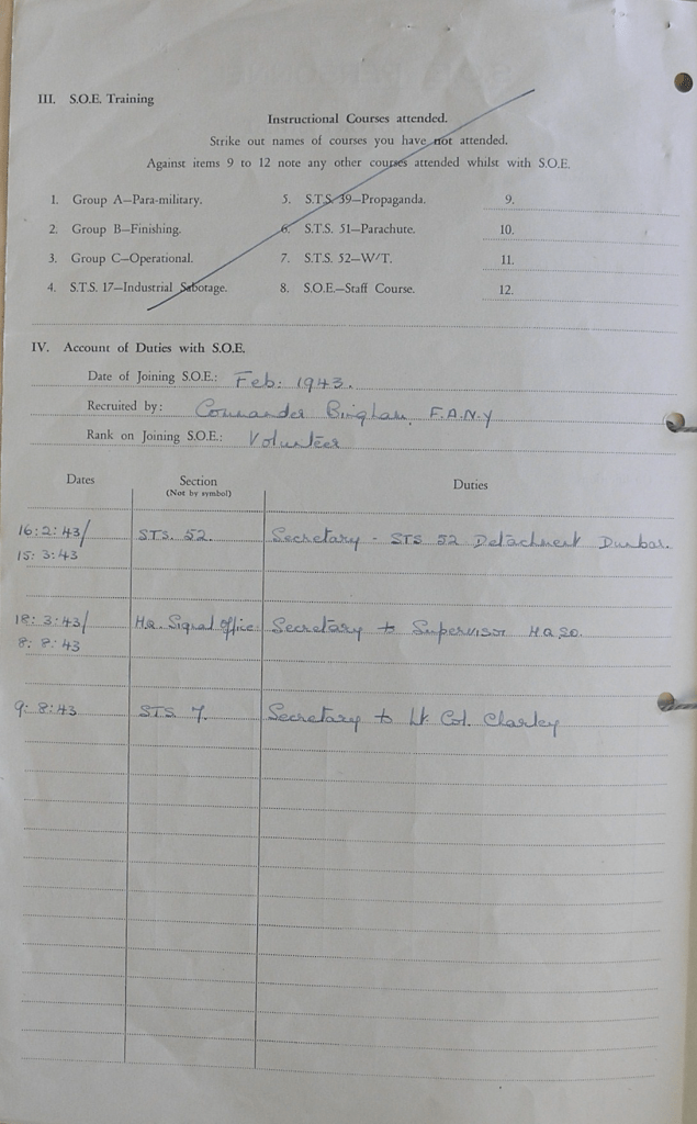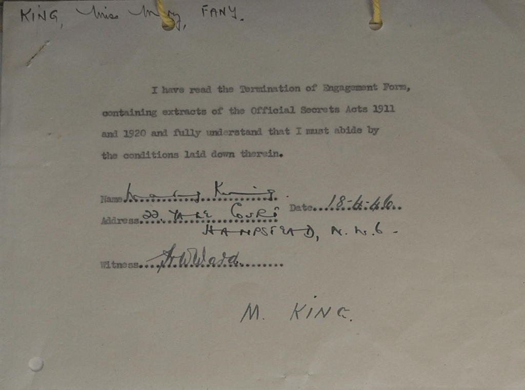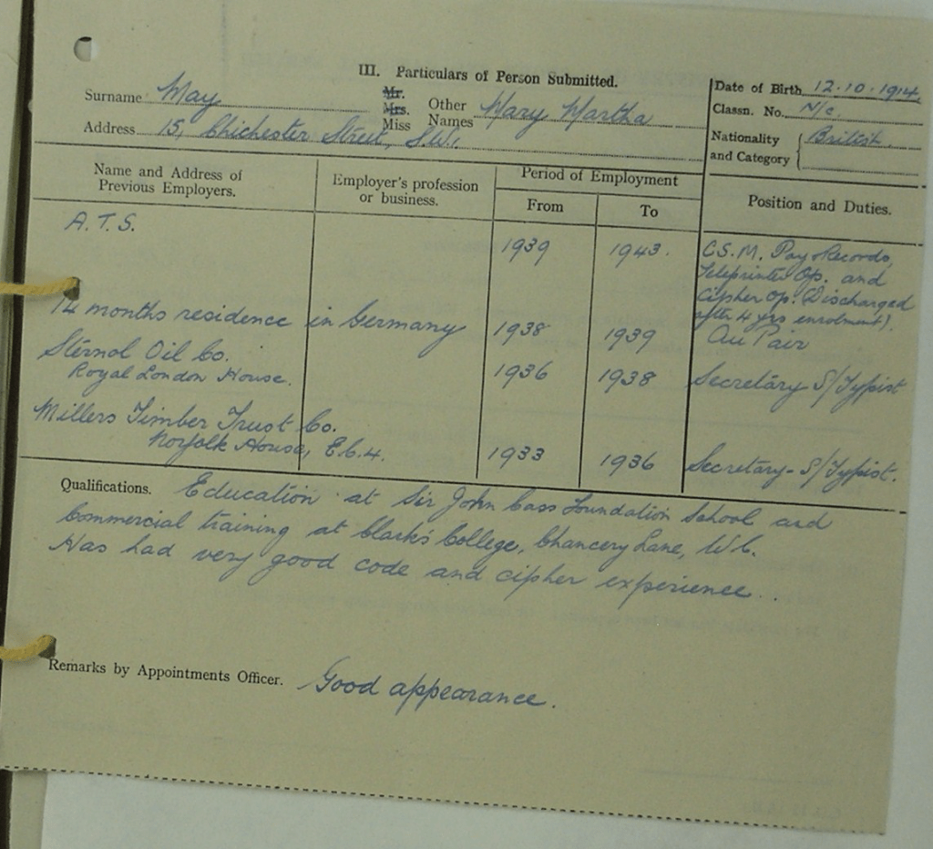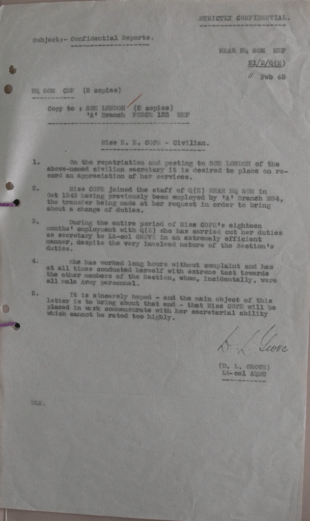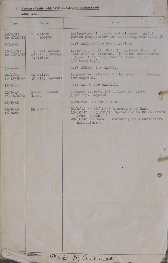 Her references describe her as very discreet for her age, based on her employment in the War Office Room 055 from August 1940 until joining SOE. In November 1945, she signed a form breaking her contract and repatriation to the UK in order to go and work in Singapore for CICB. She continued to work for MI5 until at least 1953 as a security liaison officer in Burma and Hong Kong.