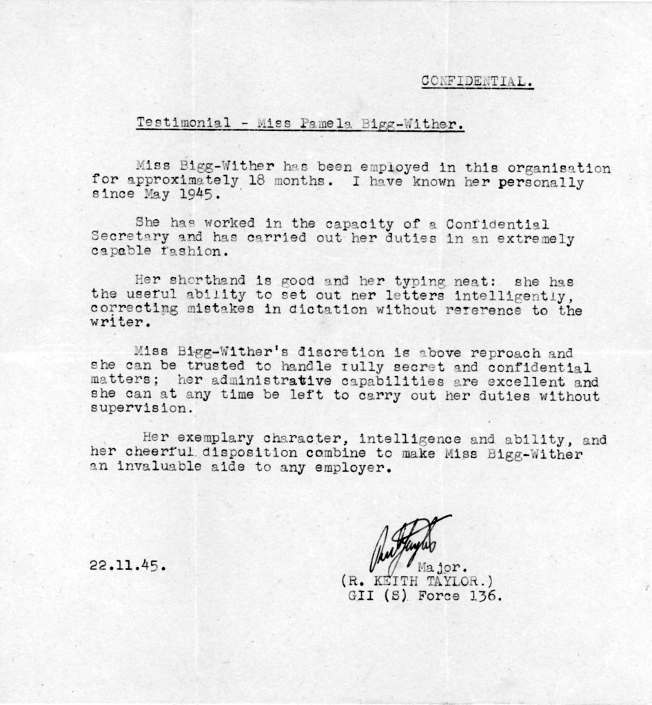 Bigg-Wither, Pamela Mary: born 29 August 1921 in Naini Tal, India, Pamela was recruited in the UK on 19 June 1944. She left for India on 18 July 1944, to be employed as a secretary. She worked in Calcutta in the War Office from August 1944.