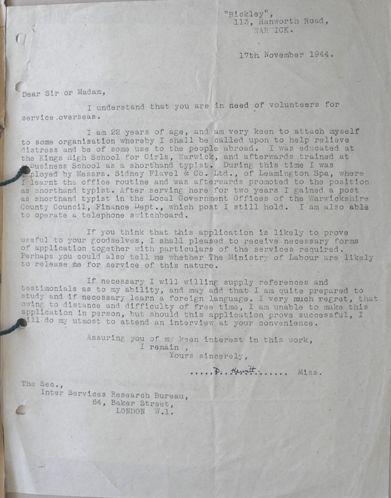 Warwick, Phyllis Elizabeth Frances: born 15 July 1909, in Gosport, Hampshire, Phyllis is unusual in that she was first vetted for SOE in March 1944 but not employed. There is no clue as to why. Presumably she continued to work as a VAD until vetted a second time in May 1945. This time she joined SOE as a FANY and she left for India on 5 September 1945. She signed her termination papers in India on 20 November 1945.