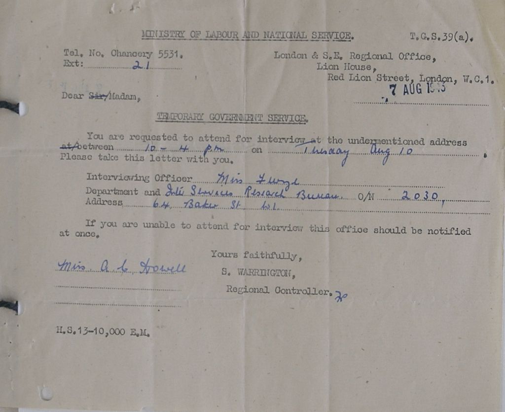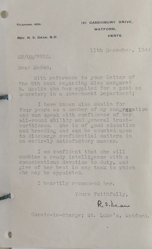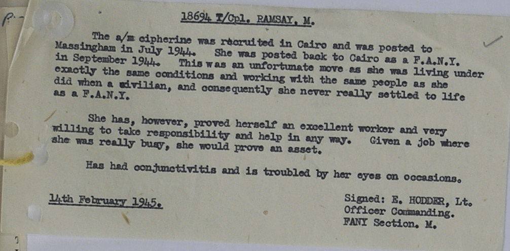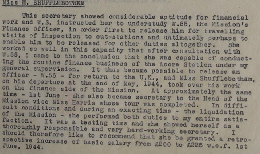 In her report for 1944, Moyra was described as ‘An intelligent, capable hard working secretary.’ This was despite the fact that earlier inn the year she appears to have lost a typewriter!
