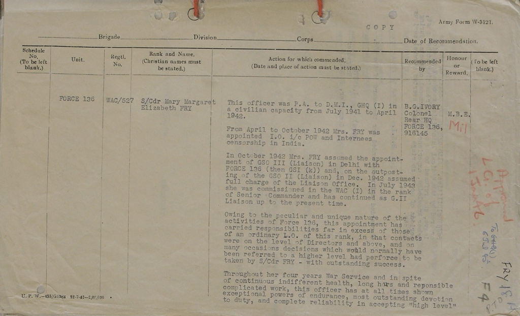 Wormley, Mollie Dorothy Treneman: born 25 November 1919 in Reading, Berkshire, Mollie was vetted on 1 September 1944, and was off to India on 10 December. She signed off on 2 January 1946. She was a FANY. She was employed as a shorthand typist. She appears to have died in 2002.