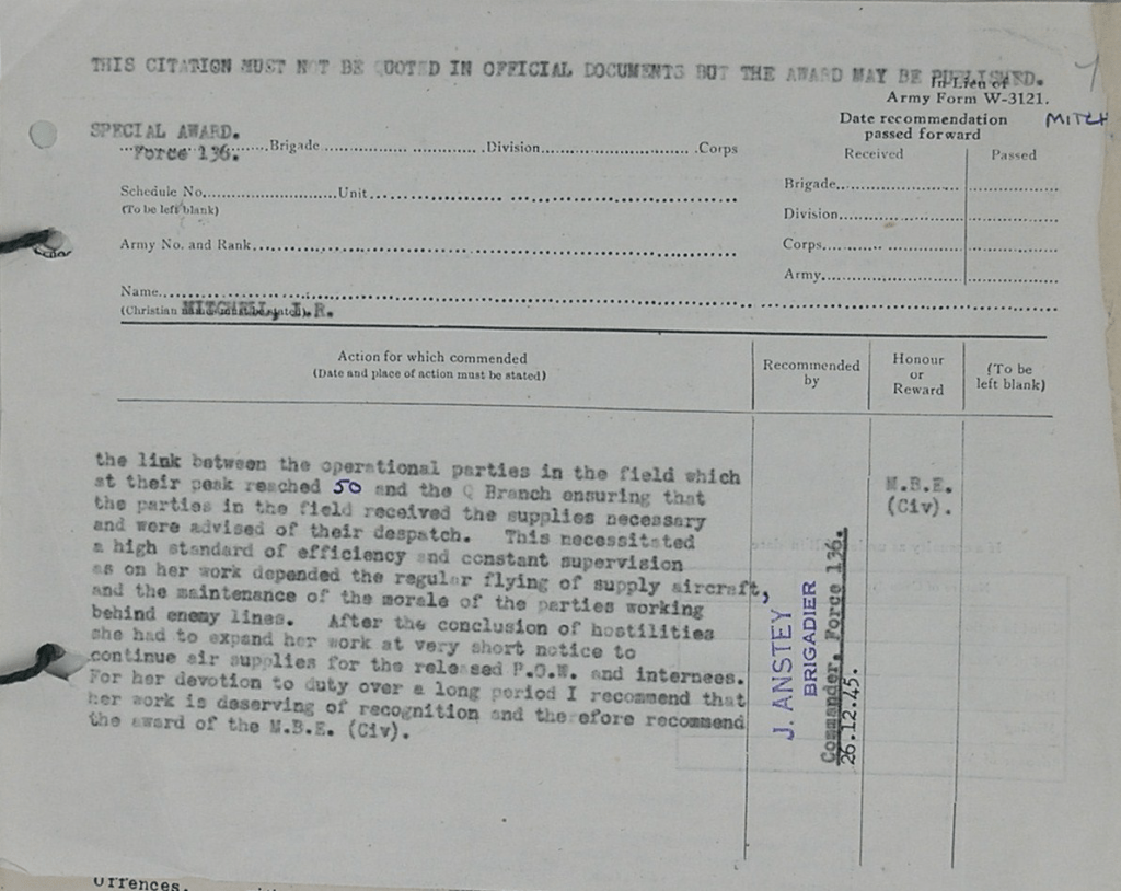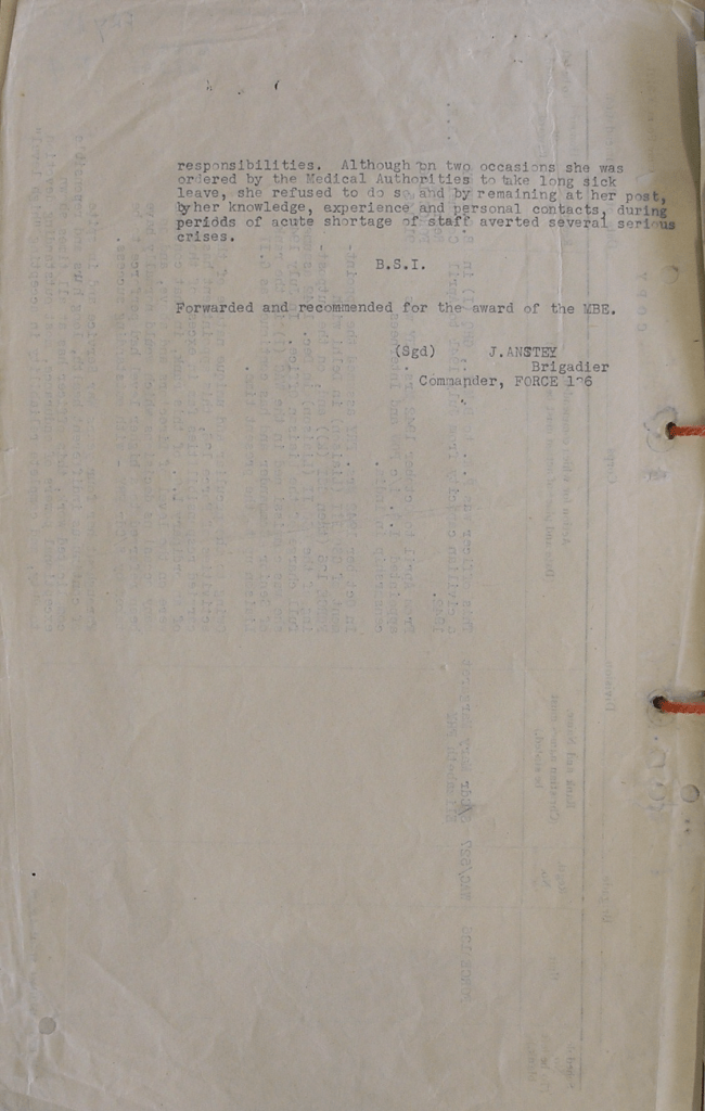 She joined SOE in May 1943 and was placed ‘in charge of the Air Operations Room at S.O.E. Headquarters’ where she remained for the next two years. She was also liaison officer between the SOE country sections and the RAF. She was recommended for the MBE for this work in May 1945. In September 1945 she went out to Ceylon as GSO III Ops, retaining her current rank. In January 1946 she was posted back to the RAF.