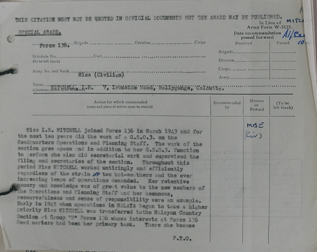 She left the UK for India in September 1944, as a FANY. After returning to the UK and signing off from SOE in August 1945, Maisie went to Germany to work with the Allied Control Commission in Hamburg until April 1947.