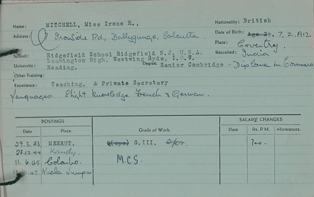 Irene’s blue record card indicates she was a clerk in General Registry and in Movements before working as a Cypherette. Also, that she left SOE on 20 September 1945, in India, and her new ‘NOK’ was Captain R.G. Walker. Another young lady who found love on war service in India!