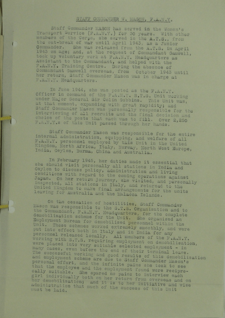 Ward, Elsie Charlotte: born 20 November 1901 in Potters Bar, Elsie was already FANY when she joined SOE at the late date of 29 June 1945. She only signed off on 11 July 1946, which is also much later than the norm. She left for India on 7 August 1945.