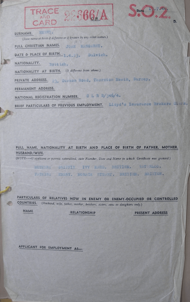 Amer, Mary Margaret: born 5 December 1923 in Staines, Mary was first vetted for SOE work in January 1945. It took until June for her to be made available from her job with The Mond Nickel Company Ltd. She had been with the company for five years and was regarded ‘a reliable and discreet worker’ within their research and development department.