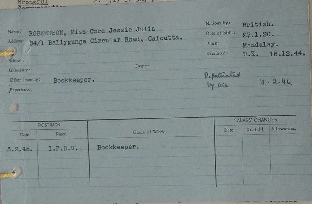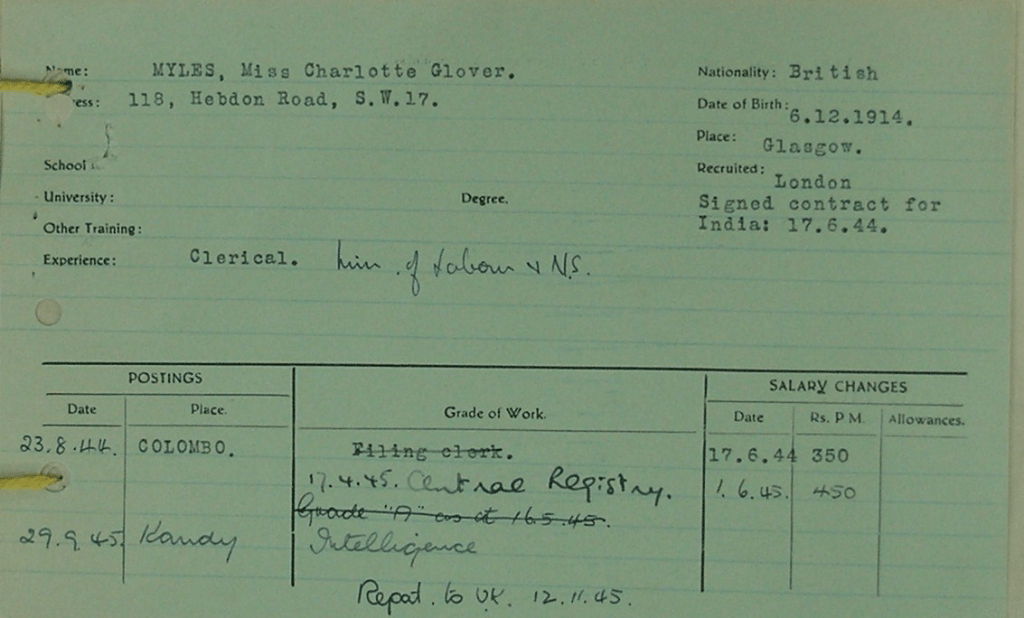 She left for India on 10 July, and worked in Colombo as a clerk. She left for the UK on 17 November, arriving on 12 December 1945.