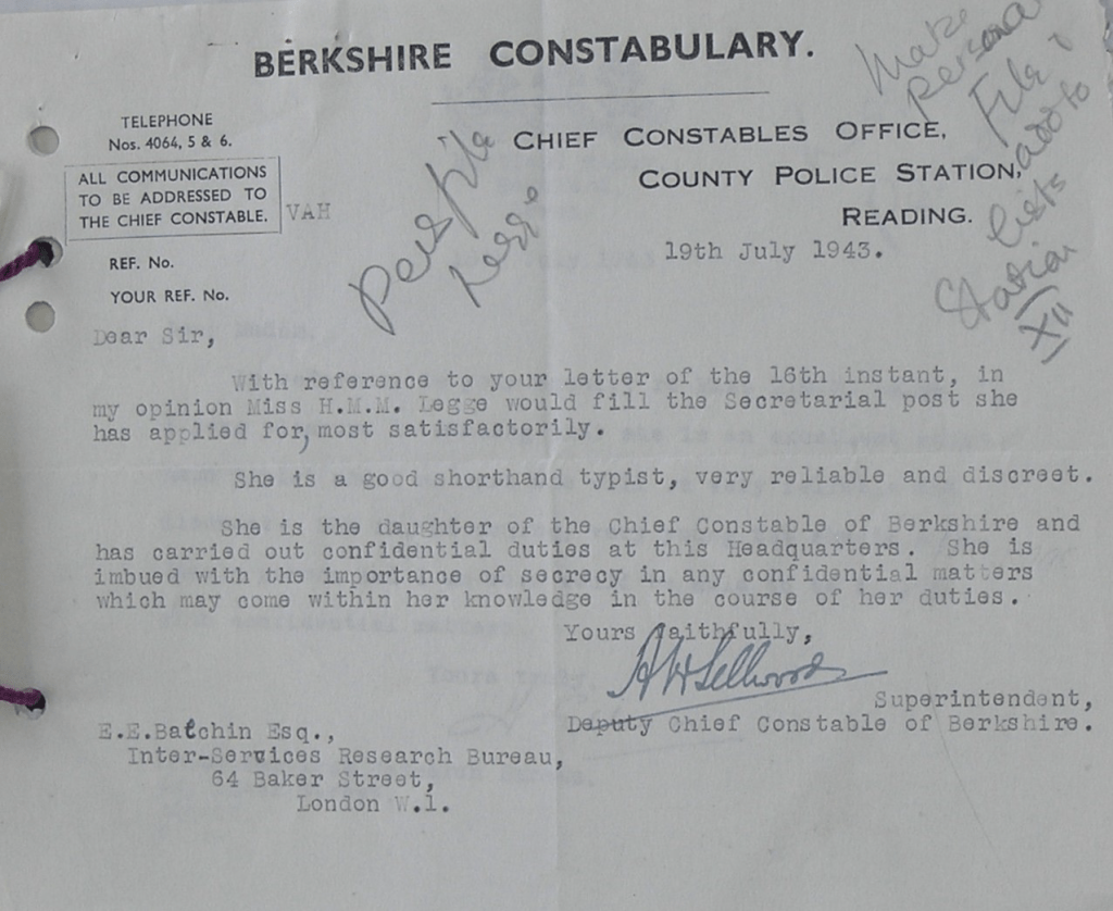 Stll only eighteen when considered for SOE work, her school, Oak Hall in Haslemere, was asked for a reference. Apparently she had been ‘a thoroughly satisfactory pupil, and a nice girl.’ She left the school at sixteen, so they couldn’t say much more than that! From school she went to Mrs Hoster’s Secretarial College, from where her reference described her as ‘a good intelligent student.’ These qualities continued in SOE, for in June 1945 she was recommended for promotion which was supported because she was ‘an excellent secretary’.